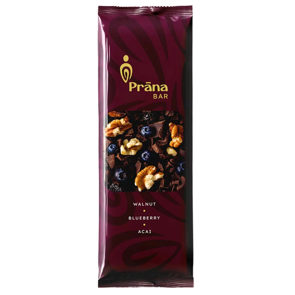 Der Prana Walnuss-Heidelbeer-Riegel mit Acai-Pulver vereint den vollen, charakteristischen Geschmack der Walnuss mit den frischen, leicht säuerlichen Noten der Heidelbeere und dem besonderen Aroma des Acai-Pulvers.